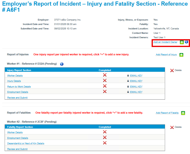 The Incident Owner is the only person with full access to an Employer’s Report of Incident – Injury and Fatality Section. They are responsible for all of the information and for submitting a completed Incident Report, as well as any Injury Report or Fatality Report required.